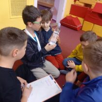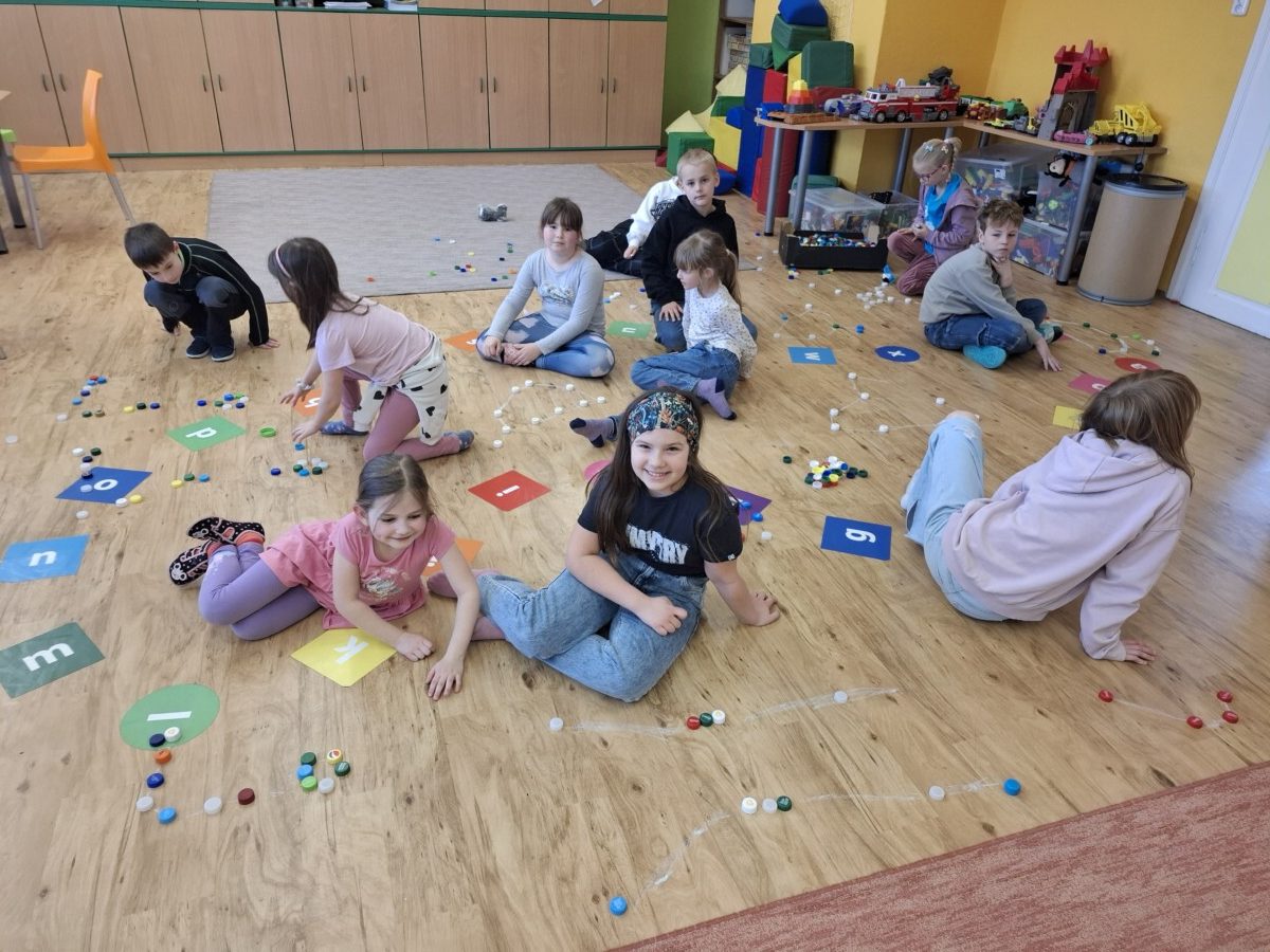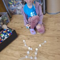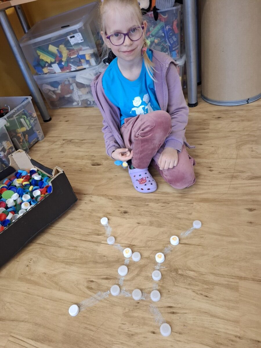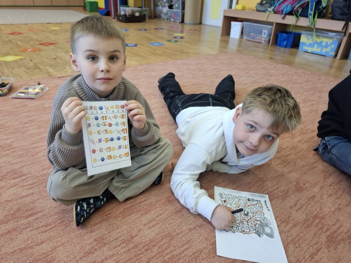 Další část programu byla věnována hvězdným souhvězdím a motivům zvěrokruhu. Pomocí PET víček vytvářeli kosmonauti vlastní souhvězdí a rozvíjeli tak svou představivost i jemnou motoriku. Velmi zajímavou aktivitou byla identifikace UFO – děti kreslily obrázky podle hodu kostkou, a to oboustranně. Každý výtvor byl originální a plný fantazie. Následovalo pátrání po UFO, které přineslo napětí i spoustu zábavy. Pocit stavu beztíže si malí astronauti vyzkoušeli při čtení slov „poletujících“ v raketě – slova byla umístěna v lahvi s vodou, což simulovalo jejich pohyb bez gravitace.