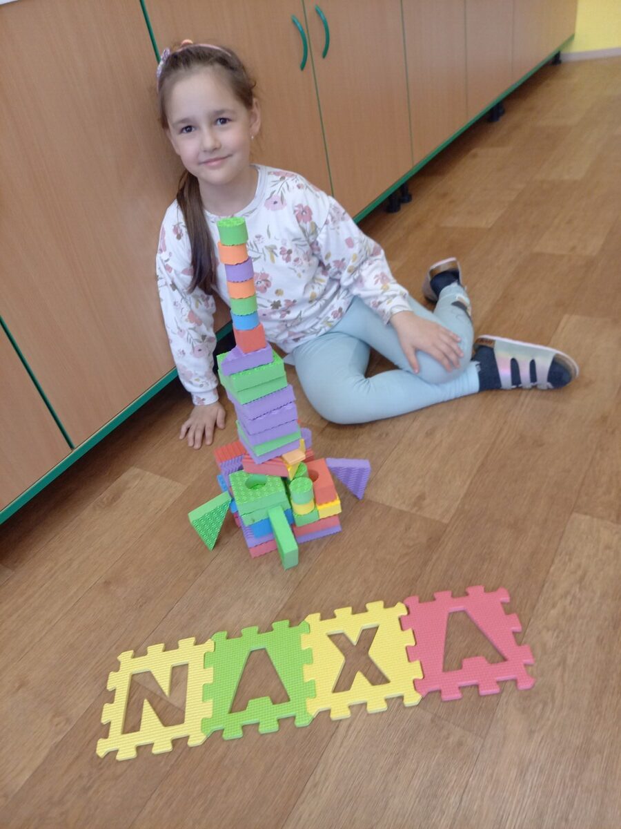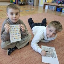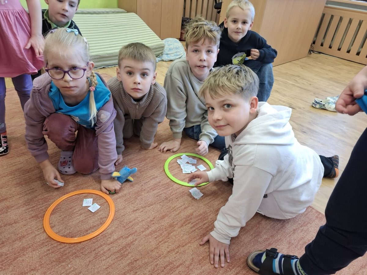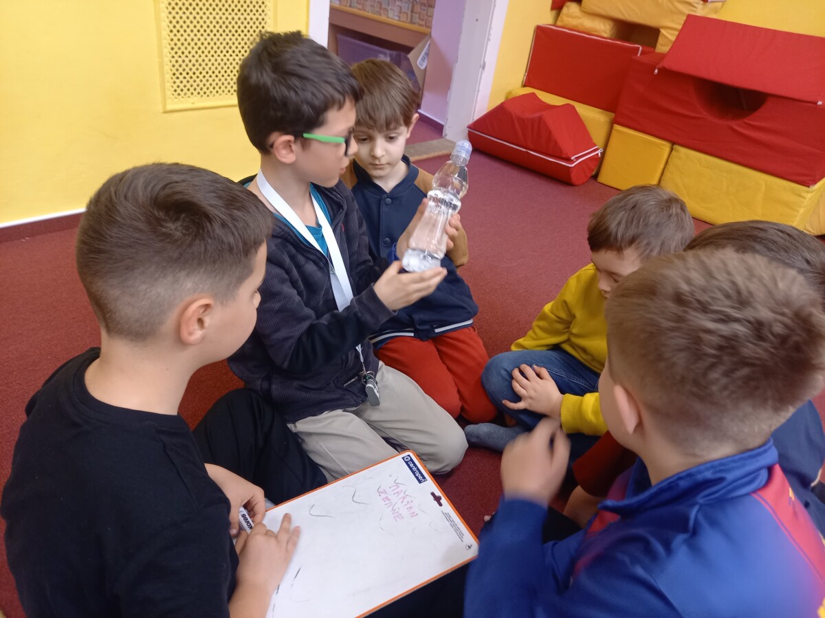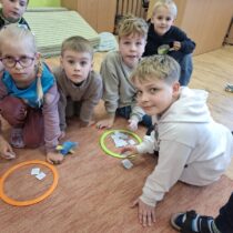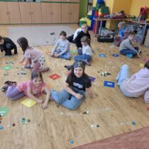 Další část programu byla věnována hvězdným souhvězdím a motivům zvěrokruhu. Pomocí PET víček vytvářeli kosmonauti vlastní souhvězdí a rozvíjeli tak svou představivost i jemnou motoriku. Velmi zajímavou aktivitou byla identifikace UFO – děti kreslily obrázky podle hodu kostkou, a to oboustranně. Každý výtvor byl originální a plný fantazie. Následovalo pátrání po UFO, které přineslo napětí i spoustu zábavy. Pocit stavu beztíže si malí astronauti vyzkoušeli při čtení slov „poletujících“ v raketě – slova byla umístěna v lahvi s vodou, což simulovalo jejich pohyb bez gravitace.