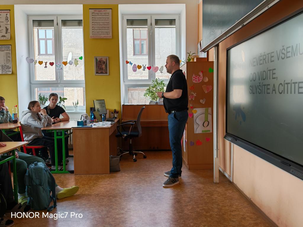 Dne 3. března 2026 proběhla na naší škole v rámci projektu Odborníci do škol odborná přednáška Ing. Tomáše Hirta na téma Kritické myšlení v době umělé inteligence.